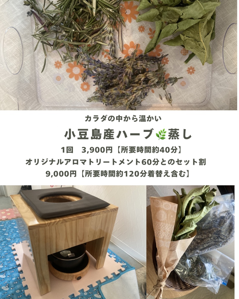小豆島産ハーブ🌿を用いたハーブ蒸しカラダの芯から温めて万病予防に女性特有の不快な症状をハーブ🌿のチカラを借りて和らげていくことを期待小豆島で育ったハーブの香りに癒されてください♪
